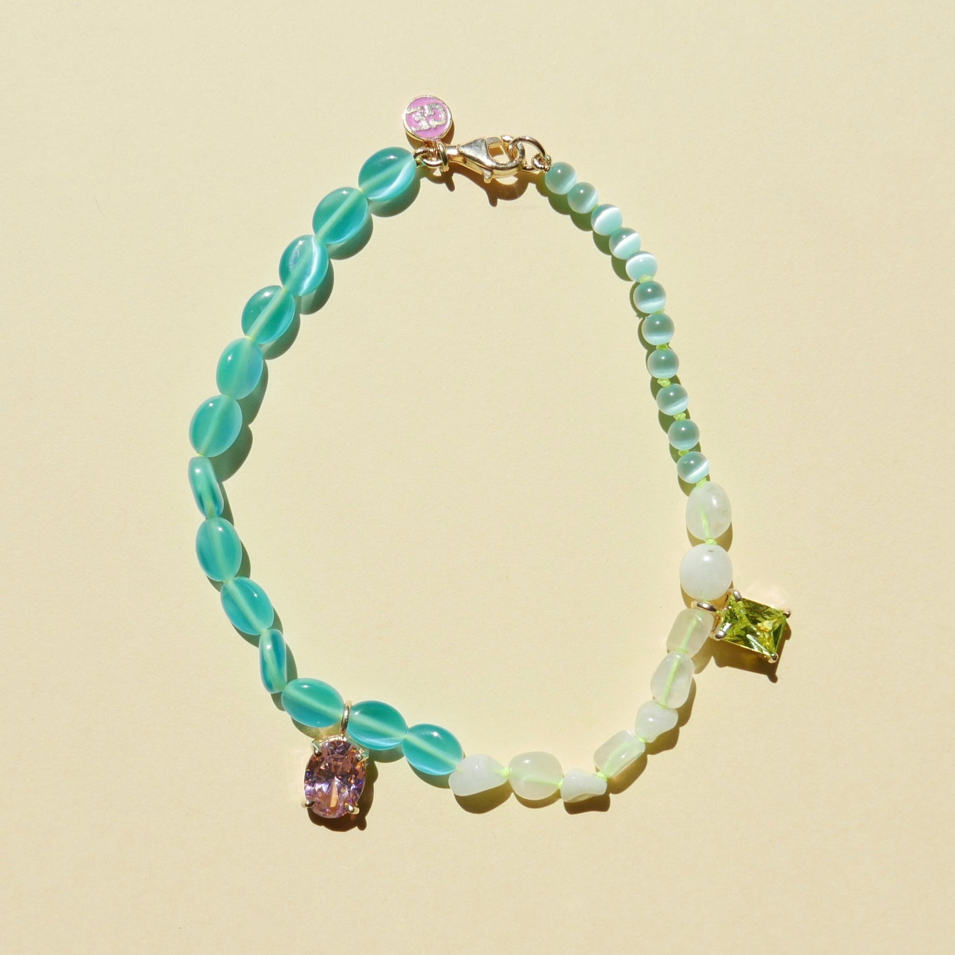 Natural stones, resins, and premium Cubic Zirconia set in 18K gold plated sterling silver.