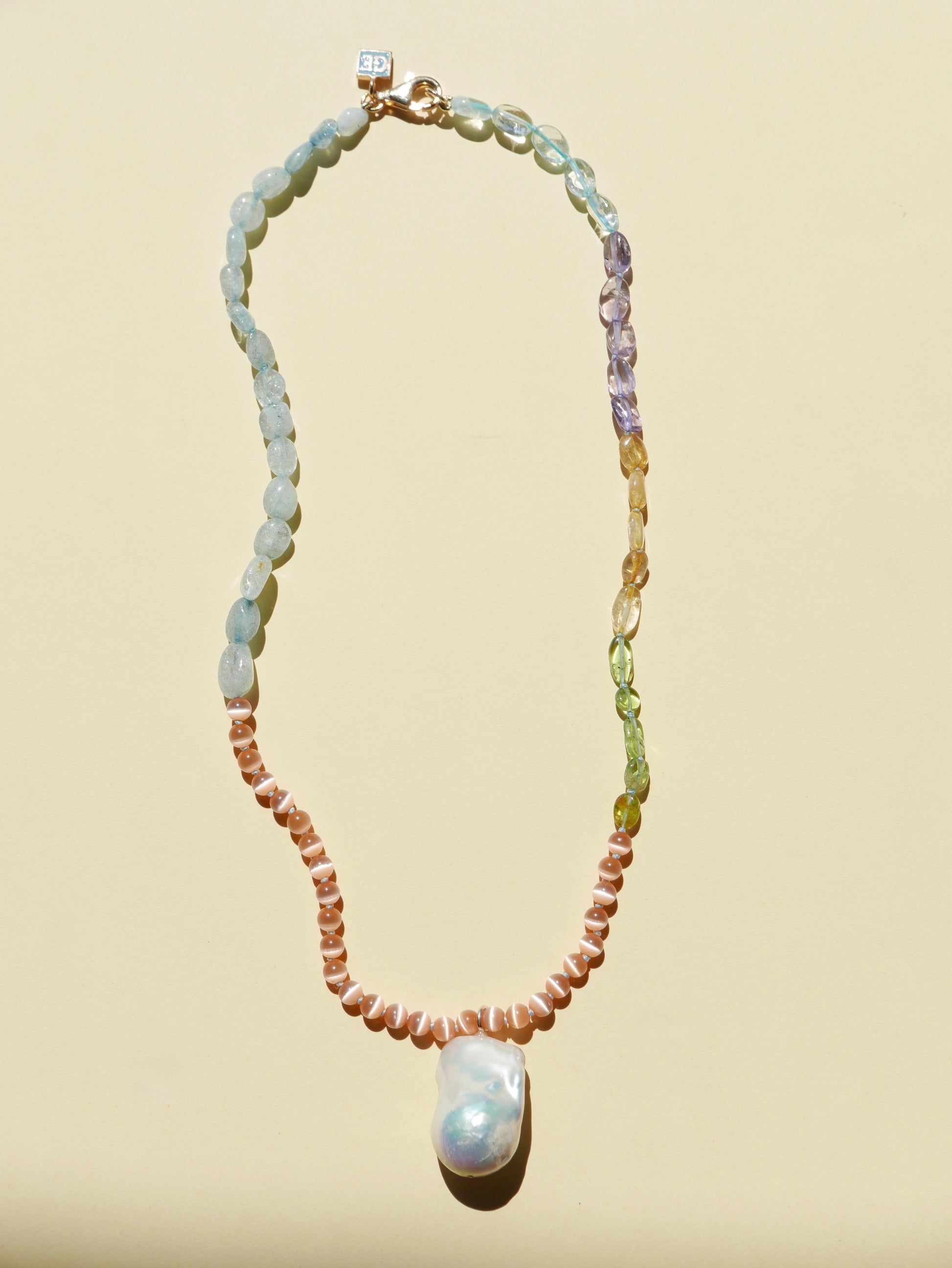 Centering a baroque pearl. Pendant necklace with natural stones and resins set in 18K gold plated sterling silver.