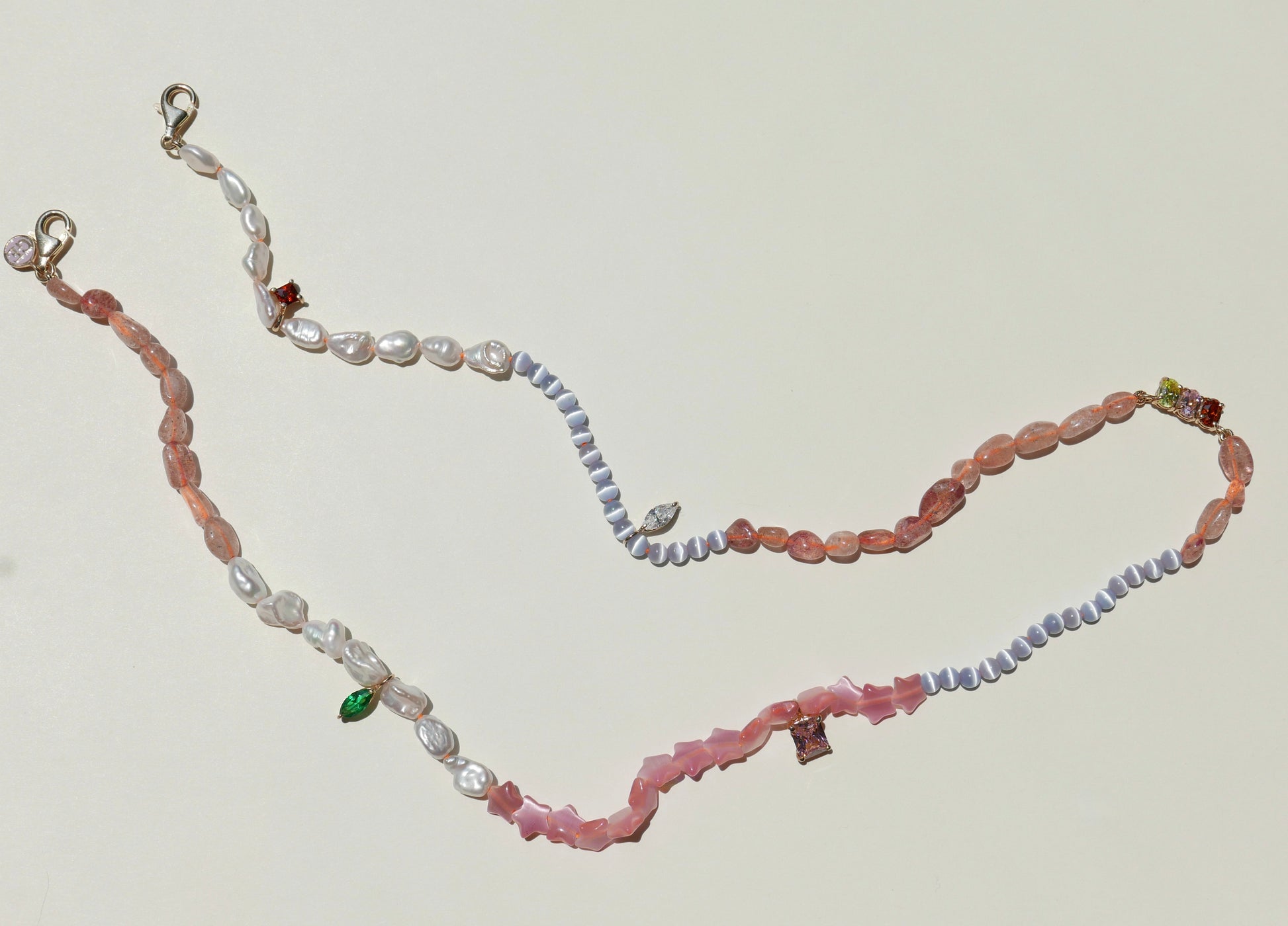 Keshi pearls, natural stones, resins, and premium Cubic Zirconia set in 18K gold plated sterling silver setting. Adjustable as a mask chain, eyeglasses chain, and long necklace.