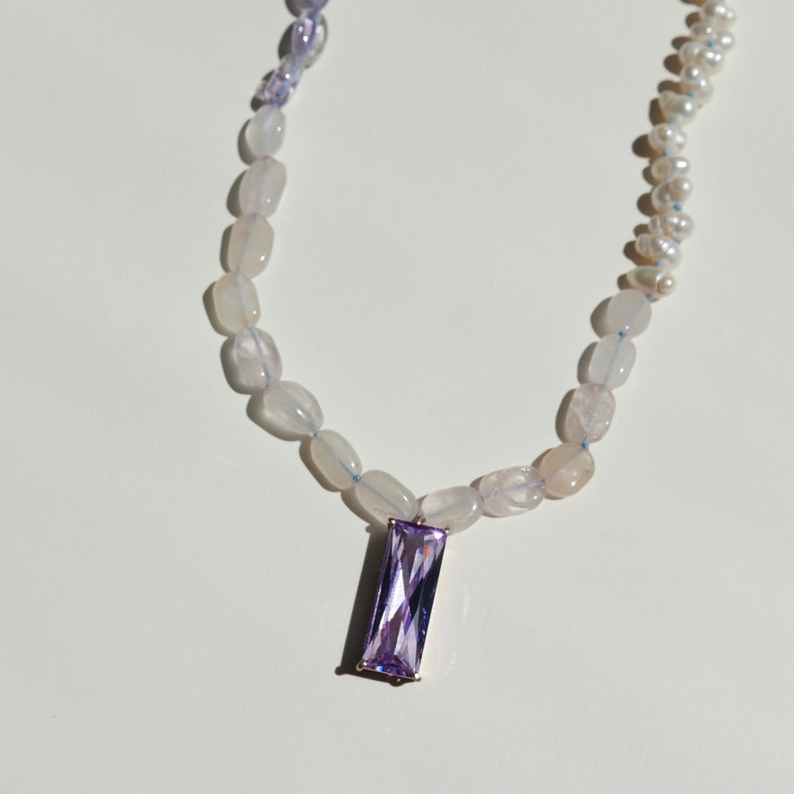 Natural stones, freshwater pearls, and premium Cubic Zirconia set in 18K gold plated sterling silver setting.